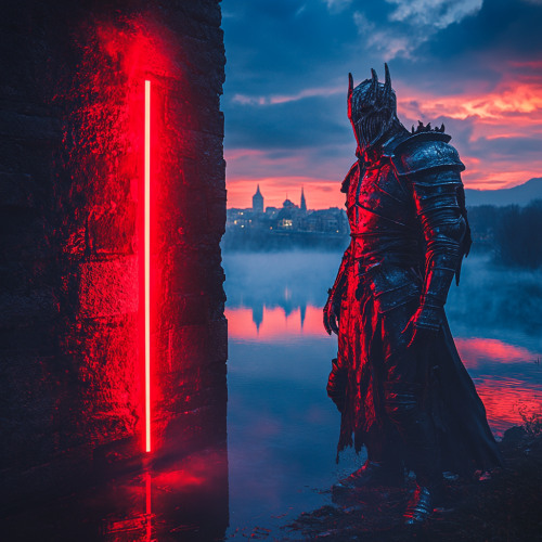 A full body photograph of an undead knight with torn armor, in the style of horror fantasy, Photo realistic, misty lake, neon red glow from a portal door on the side, distroied city in the background --style raw