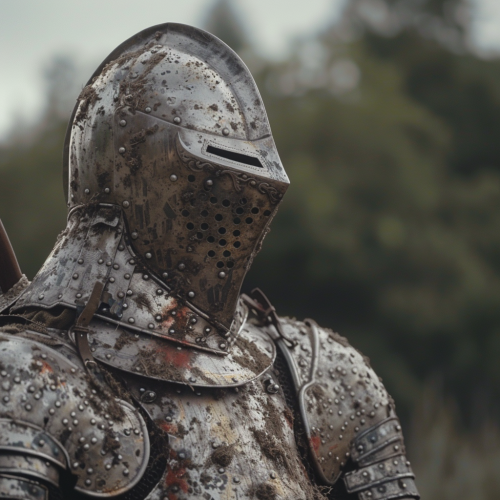 A medieval knight looking distressed in battle, clutching a small locket with a painting of a cat, dramatic lighting, realistic style --v 6.0 --ar 9:16