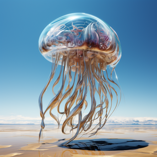 create a jellyfish swimming in the deep blue ocean. Make it realistic, aesthetic, cinematic. Descripton also includes technical details of photographic shoot, such as the use of a Sigma Art 14mm f/1.8lens, a sertting of ISO 3200, an aperture of f/1.8--ar 4:5--stylize 250--v 6.0