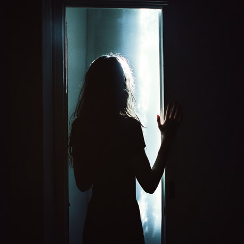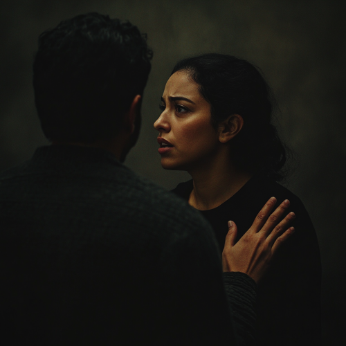 A Latina woman in profile, engaged in a conversation with another person who stands in front of her, showing a supportive and comforting demeanor. Close behind her, the dark shadow of an ominous man looms, his hands positioned as if he is about to choke her, creating a stark contrast between the warmth of the conversation and the threat of her past. The scene is dimly lit, with soft light highlighting the woman's features and the supportive figure in front of her, while casting a menacing shadow that amplifies the atmosphere of tension and fear.