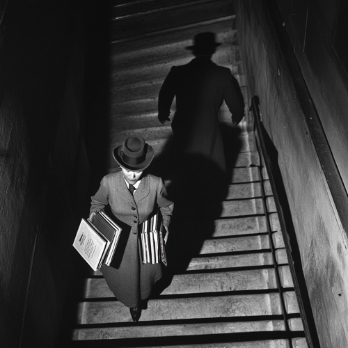 super panavision 70, high angle, 1950s office building stairs, 60 year old woman walks down the stairs holding many heavy books, the ominous shadow of a big man in a black coat and hat aproaches, daytime