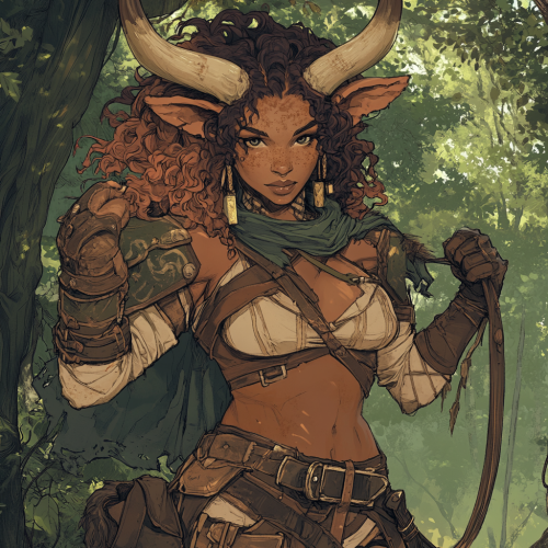 a beautiful but intimidating dnd female firbolg barbarian, with long cow floppy ears, vitiligo skin, Mediterranean features, dark features, plus sized woman, giant height, alternative, heavyweight curly hair, full body. Digital illustration, fine lines, detailed, color.