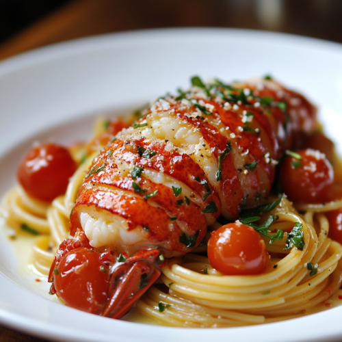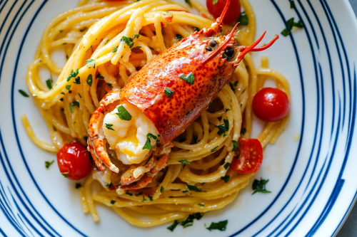 STYLE: Close-up Shot Top view | EMOTION: Tempting I SCENE: Buttered Lobster Pasta with Cherry Tomatoes A plate of spaghetti with one large single crab meat, dressed in tomato sauce and fresh herbs. The pasta is made from white flour, the juice has been mixed into it to create an oil-slick effect. A blue stripe on each side forms part of its patterned background | TAGS: High-end food photography, clean composition, dramatic lighting, luxurious, elegant, mouth-watering, indulgent, gourmet | CAMERA: Nikon Z7 | FOCAL LENGTH: 50mm | SHOT TYPE: Close-up | COMPOSITION: Top view Centered | LIGHTING: Soft directional light | PRODUCTION: Food Stylist --ar 3:2