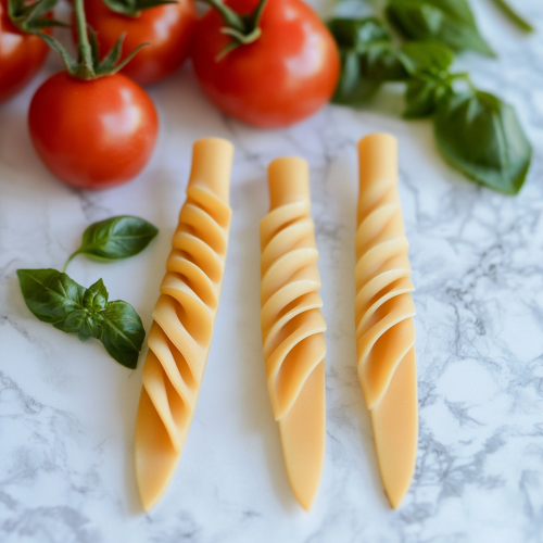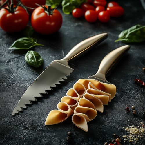 Twin knives they have a simple but elegent design, The blade is flat, long, and sharp resembling both a dagger and a chef's knife. They are made of uncooked pasta. The background features tomatoes and basil