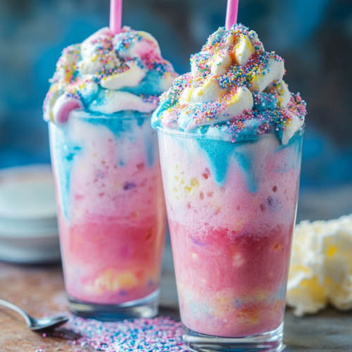 RECIPE NAME: Unicorn Cotton Candy Frappe Step into a world of magic and sweetness with this Unicorn Cotton Candy Frappe, a vibrant and whimsical treat that’s sure to brighten your day. Ingredients: For the Frappe: 2 cups ice 1 cup milk (whole or almond) 1 cup cotton candy-flavored syrup 1 teaspoon vanilla extract ½ cup vanilla ice cream (optional for extra creaminess) Pink and blue food coloring | Amateur photo from reddit, taken with an iPhone 14 Pro . | SHOT TYPE: Macro Shot Focus on the details --ar 1:1
