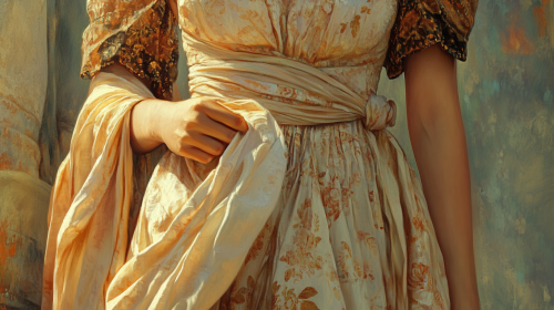Close up picture, beautiful extremely detailed flowy dress worn by woman, unique color palette, dress is in focus, blur in edges, oil painting, ancient rome style, aesthetic atmosphere, in the style of tom bagshaw, photorealistic detailing, frank xavier leyendecker, unique colors, daniela uhlig, bloomcore, outdoor background, sunlight, beige tan colours, golden ornate --ar 16:9