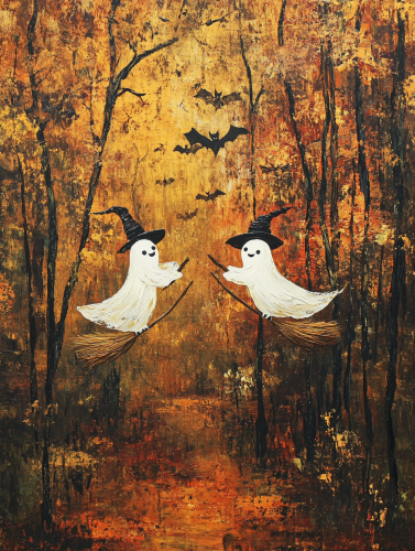 Two cute white ghosts flying on a broomstick in witch hats in an autumn forest. The whole scene is made in oil painting technique on canvas. It has a vintage dark academic style --ar 3:4
