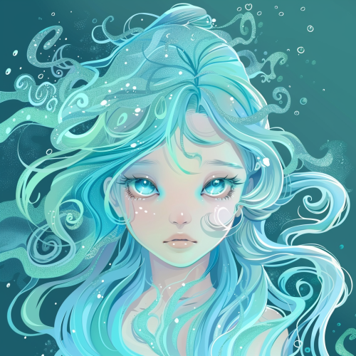 Create a cartoon illustrator for an ethereal water character, humanized character, shimmering and misty atmosphere, prismatic shape, serene and harmonious eyes --style raw