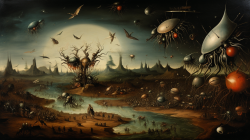 oil painting style Jheronimus Bosch vlaamse primitieven, alien battle scene epic ufo lasebems , --ar 16:9 --v 5.2