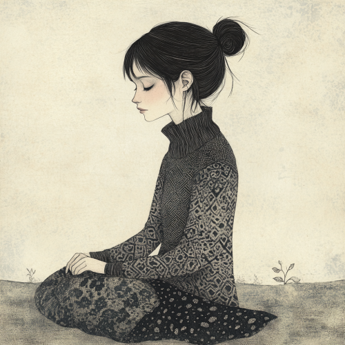 Create an illustration inspired by Edward Gorey’s style, featuring a young woman seated with an air of introspective melancholy. Her pose is slightly tilted, and she wears a patterned, slightly surreal outfit with flowing, layered fabrics. Use meticulous cross-hatching to bring depth to her clothing and create subtle, textured shadows around her. The character design should be simple, with an almost expressionless, haunting face and a doll-like quality. Keep the background minimal, allowing her to sit against a soft, hazy backdrop. Add symbolic motifs, like faintly drawn butterflies or leaves around her, to hint at a dreamlike atmosphere, emphasizing the delicate, surreal beauty in the scene.