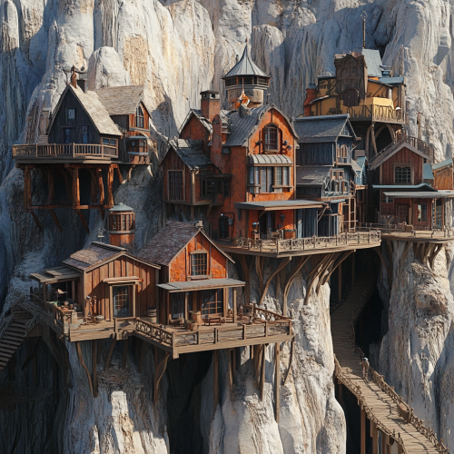 western town built on stilts built around multiple extruded rock formations with caltwaks connecting the buildings, only one or two buildings per rock formation