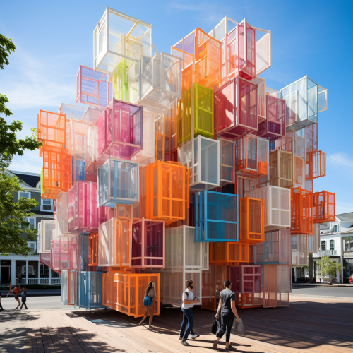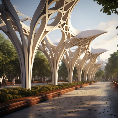 "Focus on the repetition of geometric shapes or patterns from the buildings in the park’s design, reinforcing the visual connection."