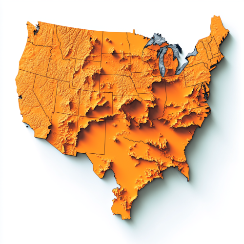 a realistic map of the United States Showing the terrain. All states rendered in white with the following states rendered in designshop’s branded orange color. Tennessee, Arkansas, Kentucky, Louisiana, Alabama, Oklahoma, Texas, Mississippi