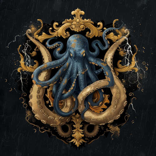 2D illustration with broad strokes, family crest coat of arms of kraken with lightning storm, using stormy dark blue and gold color palette, plain background --v 6.0