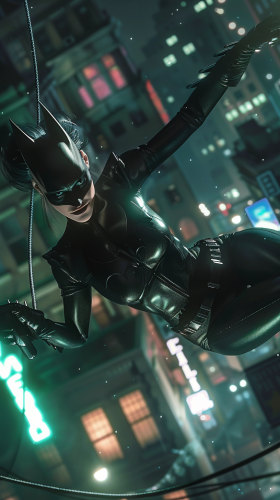 Catwoman, full-body and unmasked, mid-action as she leaps across rooftops. Her sleek black suit hugs her form as her whip is extended mid-air. Her unmasked face reveals sharp focus, and the moonlight glints off her goggles pushed to her forehead. The background features Gotham’s neon-lit streets far below. Dynamic lighting, photorealistic details, hd quality --ar 9:16 --v 6.0 --s 50 --style raw