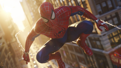 A photorealistic Spiderman unmasked, full-body in mid-swing through the city streets, his suit rippling in the wind. The web extends forward, with the background blurring to highlight his movement. His face is clearly visible, full of focus, as sunlight highlights the sharp details of his suit. Cinematic action shot, dynamic lighting, hd quality --ar 16:9 --v 6.0 --s 50 --style raw