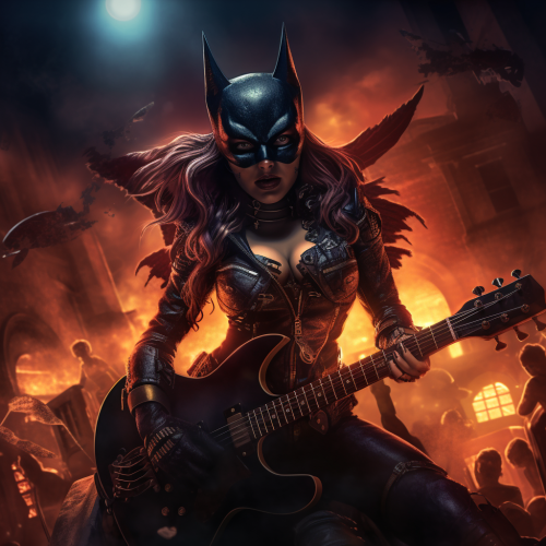 **Batman and cat woman punkrocker concert pyrotechnics nighttime, dark aesthetic. Batman has a guitar, Wild West, packed audience