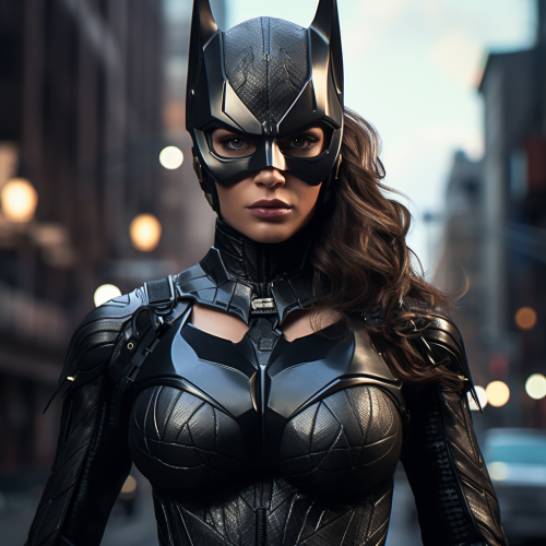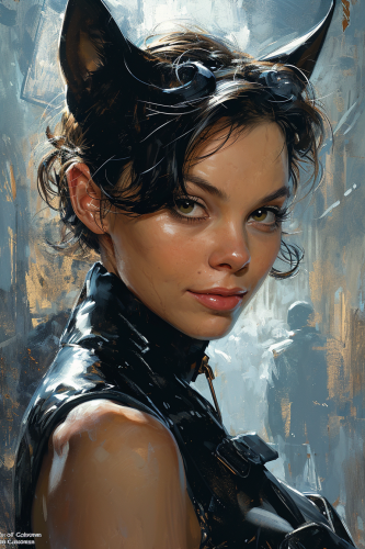 A photorealistic full-body Catwoman, unmasked, standing confidently on a rooftop in Gotham. Her black leather suit hugs her athletic form, and her whip is coiled in her hand. Her unmasked face shows a sly grin, with her black hair falling slightly over her eyes. The glowing Gotham skyline stretches behind her, with shadows cast from the tall buildings. Cinematic lighting, photorealistic textures, hd quality --ar 9:16 --v 6.0 --s 50 --style raw