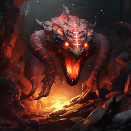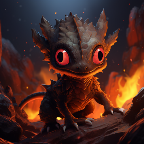 A small, mischievous jester demon with a whimsical, sinister smile, wearing a tattered jester outfit with dark, vibrant colors. The creature has glowing red eyes and sharp features, surrounded by a fiery cavern with molten lava and jagged rocks. The demon floats in mid-air, illuminated by the warm orange and yellow glow of flames, with dramatic lighting casting shadows on its devilish face. Debris and smoke fill the intense, dynamic atmosphere. The scene balances playful and ominous tones, with high detail and a fantasy art style