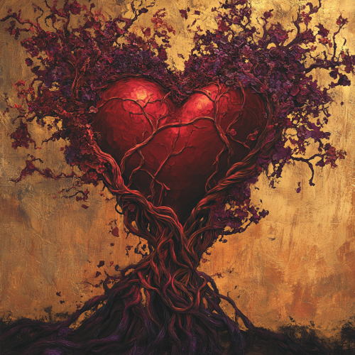Design album art for the song 'Unyielding Affection'. The artwork should capture the essence of enduring, unconditional love. Use a warm and rich color palette featuring deep reds, burgundy, and touches of gold. Incorporate imagery like two hands tightly clasped, an unbroken circle, or a heart surrounded by blooming flowers. The style should be bold yet tender, emphasizing the strength and depth of affection that remains constant and unwavering.