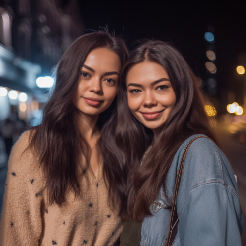 a pretty round faced british woman of columbian descent with her older sister on a night out in london wide angle full body shot, long black hair, fun night out, posing at camera, social media post, amatuer photograph, not beautiful, flat lighting, low contrast, happy times, wistful, digital camera, family photograph --v 5.0