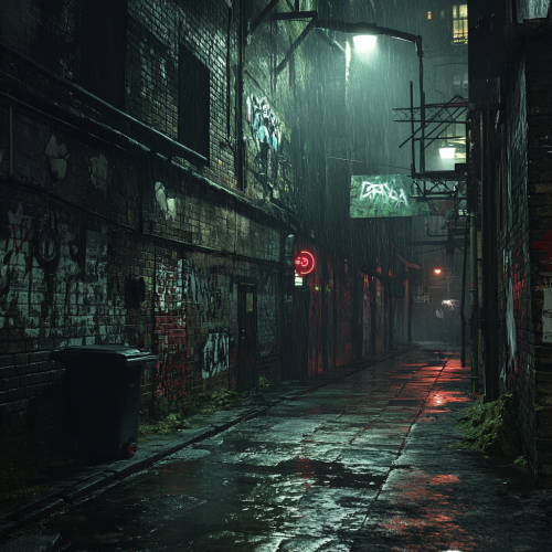 game setting concept art of a modern urban horror game set in London. An alley with a mixture of crumbling venerable walls and buildings alongside more modern touches, like grafitti and neon lights. Wet pavement and puddles help to sell the mystical, tense and occult mood. Atmospheric lighting, fog and details show the thin separation between the mystical and the mundane. Realistic, dark, noir, gritty, modern, ue5, cinematic, moody