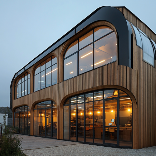 a metabolic birdhouse made of concrete and metal trim in an urban alley in the style of Fumihiko Maki, steel cables, Hasselblad 30mm lens --ar 16:9 --v 6.1