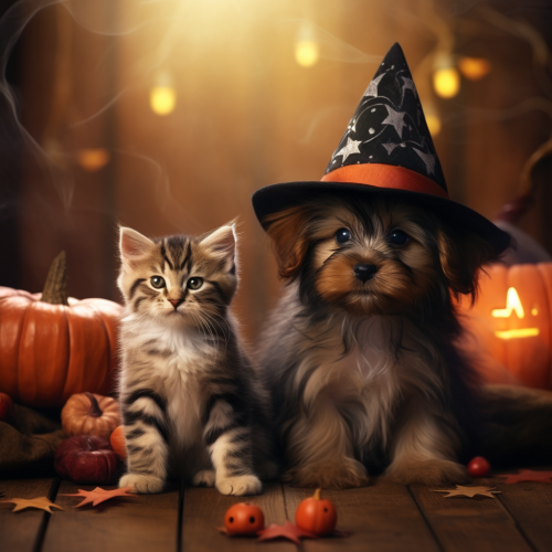 beautiful vibrant Cute puppy and kitten Witch, witch craft, lots of decoration and aesthetic, hyperrealistic, 4K