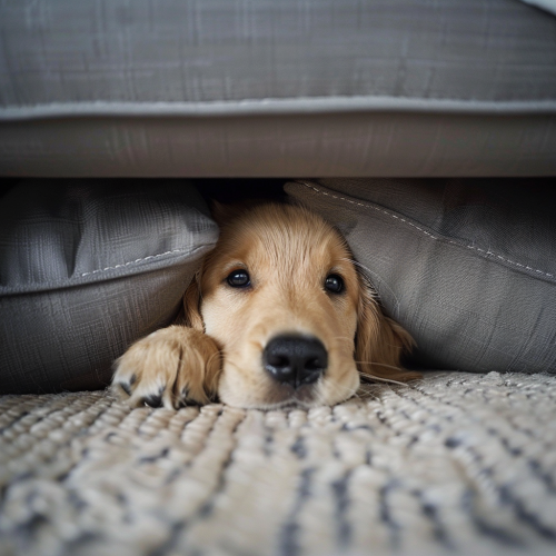 phone photo of a beautiful golden retriever puppy peeking out from under a sofa, posted to reddit in 2018