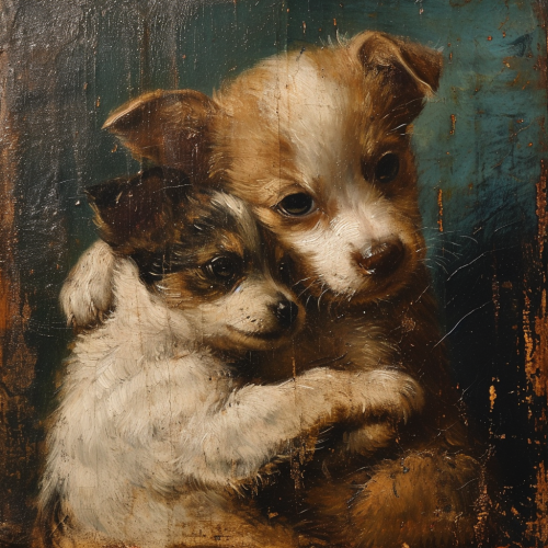 Kitten hugs puppy, icon, antique, painting, gilding --v 6.0 --ar 1:1