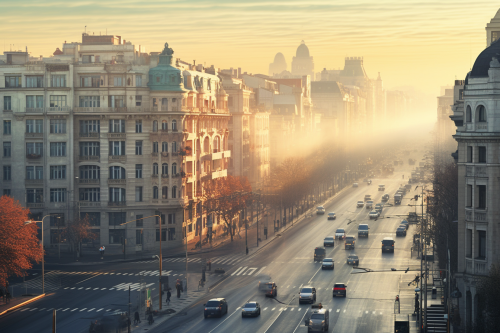 many road going through city, panoramic view, morning light, high-quality photograph in light colors, --ar 3:2
