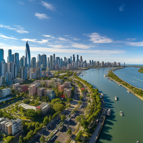 Aerial view of Kaohsiung's skyline, taken with a DJI Mavic Air 2, expert drone photography showcasing the city's vibrancy, bustling streets, and the juxtaposition of urban and green spaces. --s 250