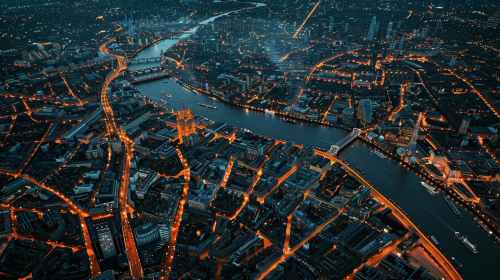 a dazzling aerial view of London, UK at night, photo realistic, hyperrealistic, high contrast, drone shot --ar 16:9