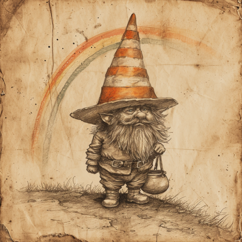 A rough pencil sketch on old paper of the end of the rainbow, a leprechaun with a traffic cone on his head and a pot with another traffic cone in it --v 6.0