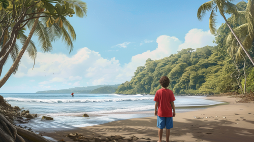 realistic, 10 year old Costa Rican boy wearing a red shirt and blue shorts stands on the edge of a tropical beach watching surfers in the distance --ar 16:9 --s 50 --v 6.0