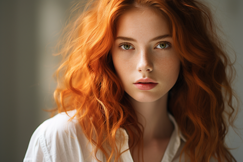 a 22 year old beautiful women from Czech Republic shot in a studio with daylight and white background, with a slight anger in her face, cinematic orange toned lightning, shot in andre 50mm, --ar 3:2 --s 250