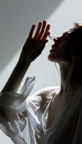 A lady hand, white background, extreme low angle, side shoot, extra contrast, cinematic, film showcase promotion, light and shadow, white background, low angle, extra contrast, full headshot, (unexpected results, unexpected realistic contemporary clothes. full body shot) --ar 4:7 --v 6.0