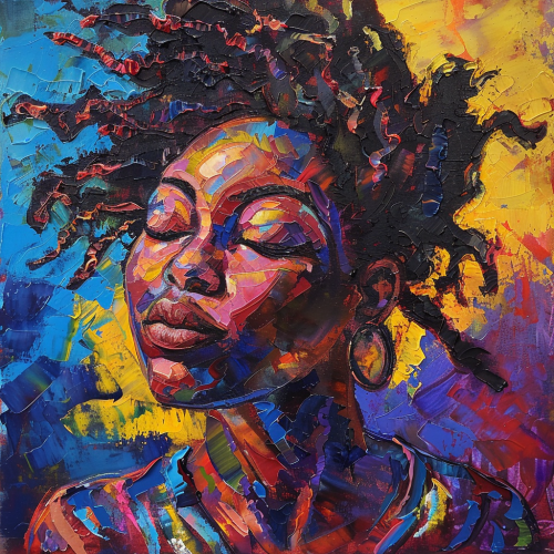 abstract painting of a black woman with Locs. Painterly brush strokes. Harlem renaissance style.
