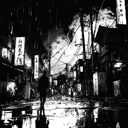 I need text like a movie title saying Monochrome should be showing in the style of a graphic novel with simple lines, black ink, low details, low resolution, everything should be black and white other, make it in the form of a Japanese Manga