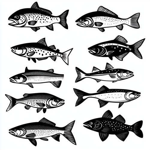A black and white vector style image of various fish including Bull trout, Humboldt cutthroat trout, Lahontan cutthroat trout, in the style of cricut SVG cut files, white background, bold and thick. fillind in black outline, simple image, mid shot