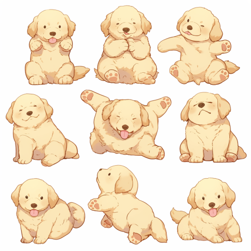 9 divisions, background white, full body, simple coloring, simple line drawing, Various poses, Various movements and actions,facial expressions (Pain, sadness, feeling unwell, fatigue),Simple design, Golden Retriever,chibi --niji 6