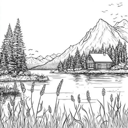 cabin on a lake with mountains and fine trees in the background, in the foreground are cat tails and scrubbery making a boarder, the style is elegant yeet simple line drawing