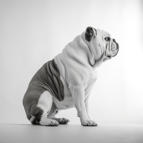 black and white photo of a handsome bulldog facing the light, sideview, full body shot, white background, dull light --v 5.0
