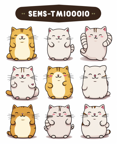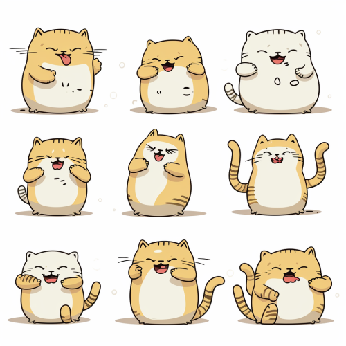 Coloring book, kawaii squishy cats doing various actions, short fat limbs, simple minimal lines, thick line, high contrast, text emoticons, expression sheet, 8 stickers same size, --ar 9:11