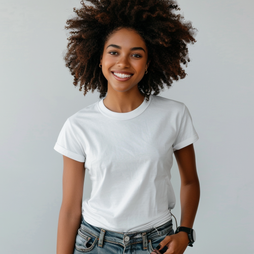 T-shirt mock up. a dark brown skin women with cardi B build with all white Tshirt on with a nice round Afro. having a good time. Random background