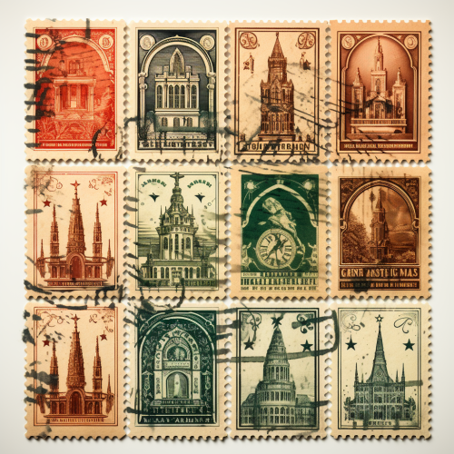 a variety of distressed old stamps with christmas design, warm vintage color palette, isolated on 100% white background --stylize 750 --style raw