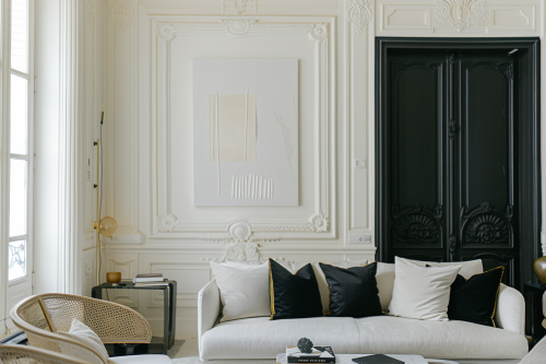 a hyper realistic photograph of a luxury high end minimalistic styled living room, B&B Italia, bright, minimal pop of deep color, kelly wearstler inspired, large minimal art work with small pops of deep muted color, white walls, elegant black trim such as crown molding, canon eos r3, 50mm, hyperrealistic, photorealism, intricate details, cinematic, megapixel cinematic lighting, anti-aliasing, SFX, VFX, CGI, RTX, SSAO, FKAA, TXAA, HDR, 8k --s 50