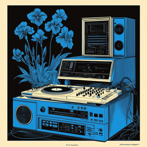 A black and yves klein blue risograph poster with vector illustrations of a disco jockey, an old macintosh with data point code, computer booth in Singapore, black iris flower, turntable, iris flower, record vinyl, psychedelic art, a vintage computer monitor, clean background , in a halftone pattern style, with bold lines, flat colors, simple shapes, in a screen print style, with a thick contour, and a highly detailed, symmetrical design --s 250