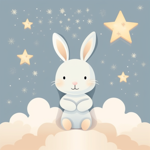 Create a vintage-style poster featuring a cute and joyful babyBunny (rabbit)with a dreamlike and minimalistic design. The vector illustration should evoke a cozy feel and use muted, pastel colors with overlapping shades. The style should be reminiscent of 1960's panels, inspired by Nordic Cartoons, Bamileke art, and simple blank art prints. This poster will be used as nursery art and should focus on a single character design. --v 5.2