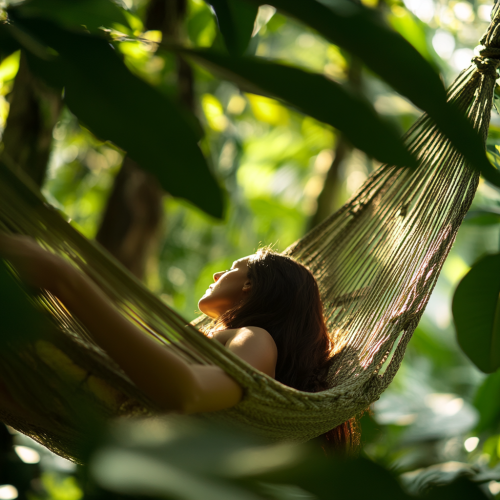 Aspect Ratio: 16:9 Color Grade: Vibrant greens, warm earthy tones Shot Angle: Low angle, looking up through jungle foliage Lighting: Dappled sunlight filtering through leaves Depth of Field: Shallow, with the subject in focus, background blurred Framing: Subject in a hammock, framed by lush jungle plants Saturation: High, emphasizing the vibrant jungle greens Texture Focus: Smooth skin contrasted with rough natural elements Shot Distance: Medium shot Exposure: Well-balanced for sun and shade details Contrast: High contrast between sunlight and jungle shadows Lens Choice: 35mm wide-angle Vignette: Light vignette to draw attention to the subject Refraction: Light refracting through dewdrops on leaves Motion Blur: Subtle blur in moving leaves Grain: Minimal grain for clarity Symmetry: Asymmetrical composition with natural jungle elements Lens Flare: Gentle flare through the trees Shadows: Soft, natural shadows cast by plants Backdrop: Lush, dense Costa Rican jungle